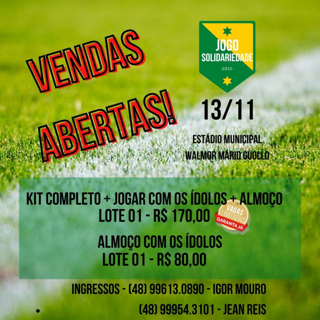 O valor do kit para jogar com os ídolos (uniforme completo), além do almoço, custa R$ 170,00. E somente ingresso para o almoço com os craques custa R$ 80,00. Para obter os ingressos e também mais informações, basta ligar para o número (48) 99613-0890 (whatsapp).