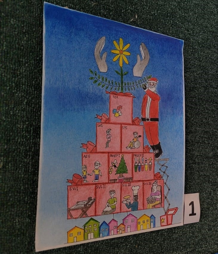 Nichele recorda que a ideia principal era incorporar a essência da APAE no cartão, usando bolas de Natal, mas o talentoso aluno optou por criar uma árvore de Natal com caixas de presente. "Dentro de cada caixa, ele desenhou símbolos que representavam cada turma da escola. No TEA, ele colocou o quebra-cabeça das cores. No SAE, temos uma aluna com dificuldades motoras significativas, então ele desenhou as mãozinhas dela. Em outra sala, ele desenhou um aluno em uma cadeira de rodas. Na padaria, ele retratou o padeiro preparando pão. Ele conseguiu compreender como cada imagem representaria cada sala e fez isso sozinho, pois Natan é um verdadeiro artista. Toda a parte artística foi realizada exclusivamente por ele", destacou a professora.