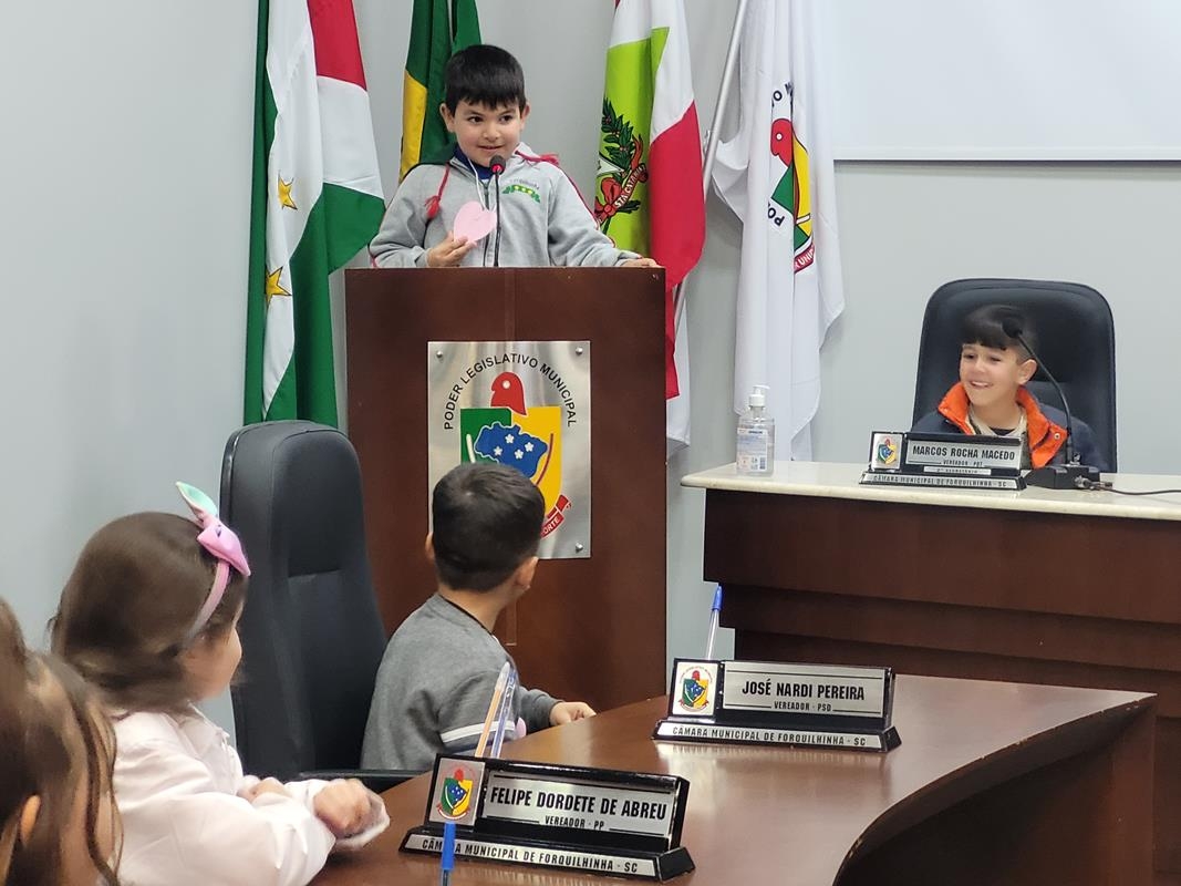 No plenário da Câmara, as crianças aproveitaram o momento para apresentar propostas. “Cada turma escolheu um candidato de prefeito e três para vereador, totalizando quatro candidatos a prefeito e 12 de vereadores. Os mais votados vão representar os alunos nas solicitações para escola”, conta a diretora Jéssica Fontoura Antqueviecz.