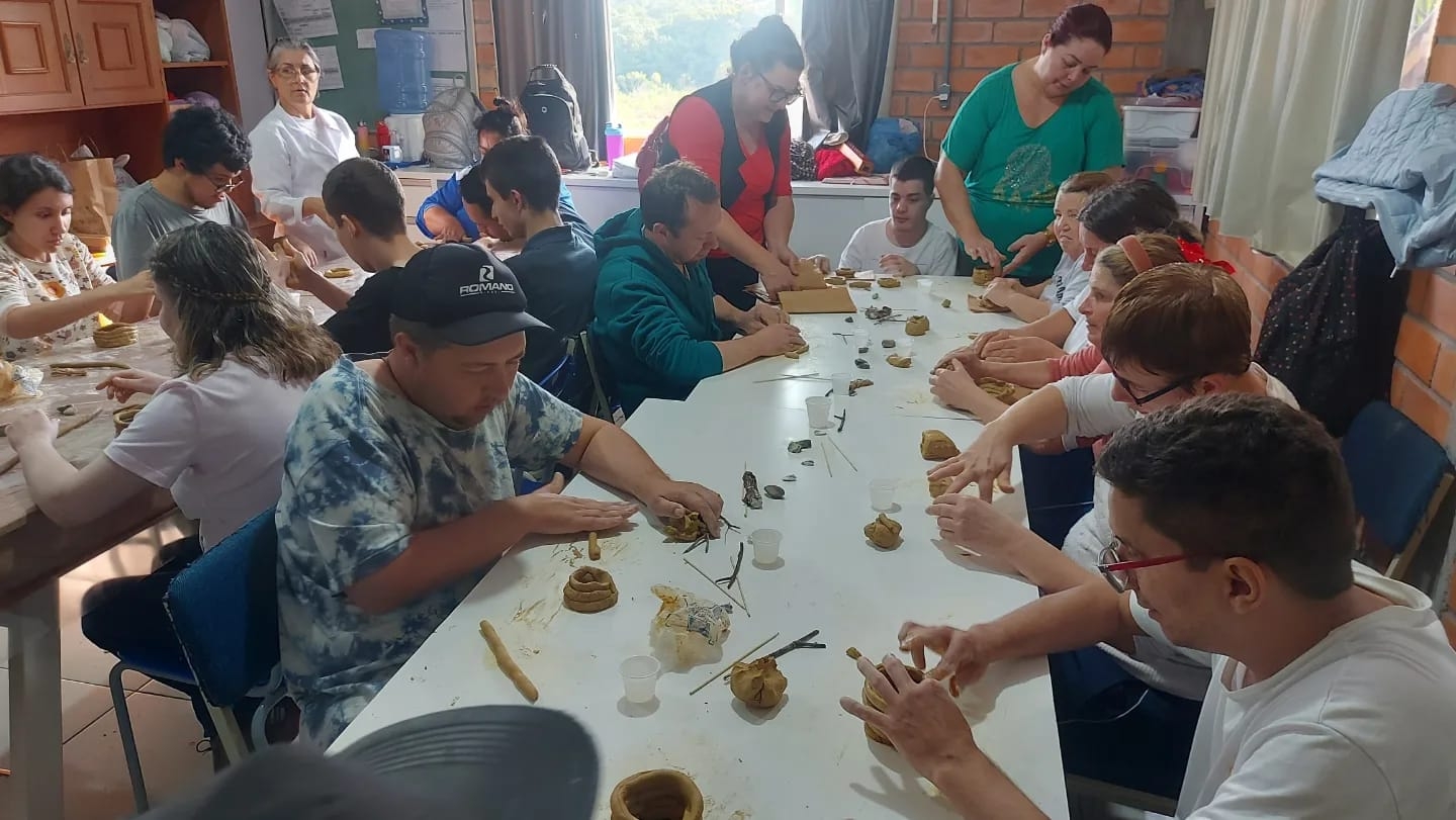 No último dia 24 de julho, a APAE de Cocal do Sul recebeu a segunda ação da proposta cultural Oficina de Cerâmica Indígena. Alunos e professores participaram da atividade, conduzida pela proponente Valdirene Böger Dorigon e por Rosani Hobold Duarte, integrante do projeto, que contou com uma apresentação sobre os grupos indígenas de Santa Catarina, com enfoque na produção da cerâmica indígena guarani, as técnicas de confecção e as técnicas decorativas. Cada participante teve a oportunidade de experimentar na prática este processo, produzindo uma peça com argila.