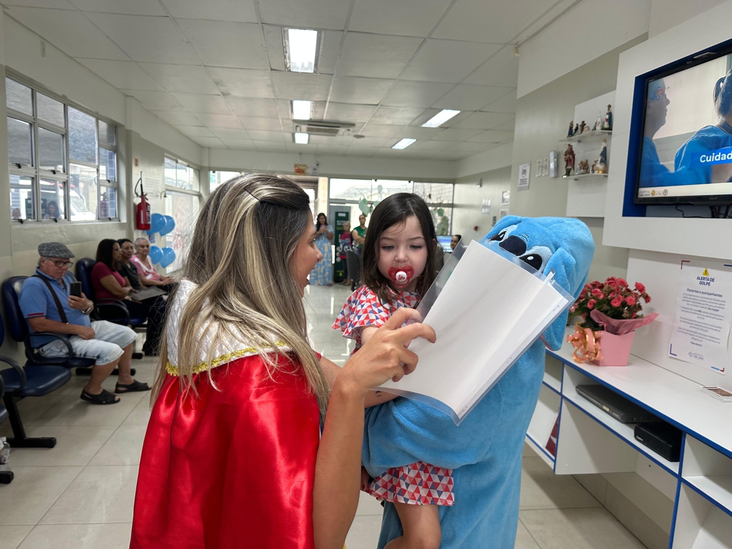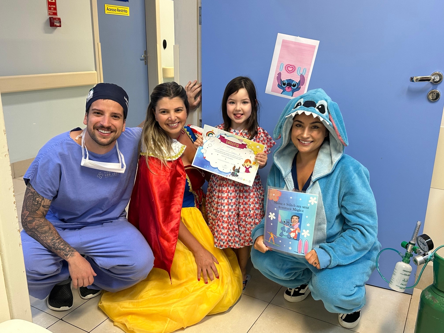 A enfermeira Larissa, a técnica de enfermagem Tainara e o médico anestesiologista dr. Guilherme, junto de toda a equipe de Radioterapia, entraram no clima da festa, com direito a usar fantasias do Stitch e da Branca de Neve, tudo pensado com muito carinho e dedicação.