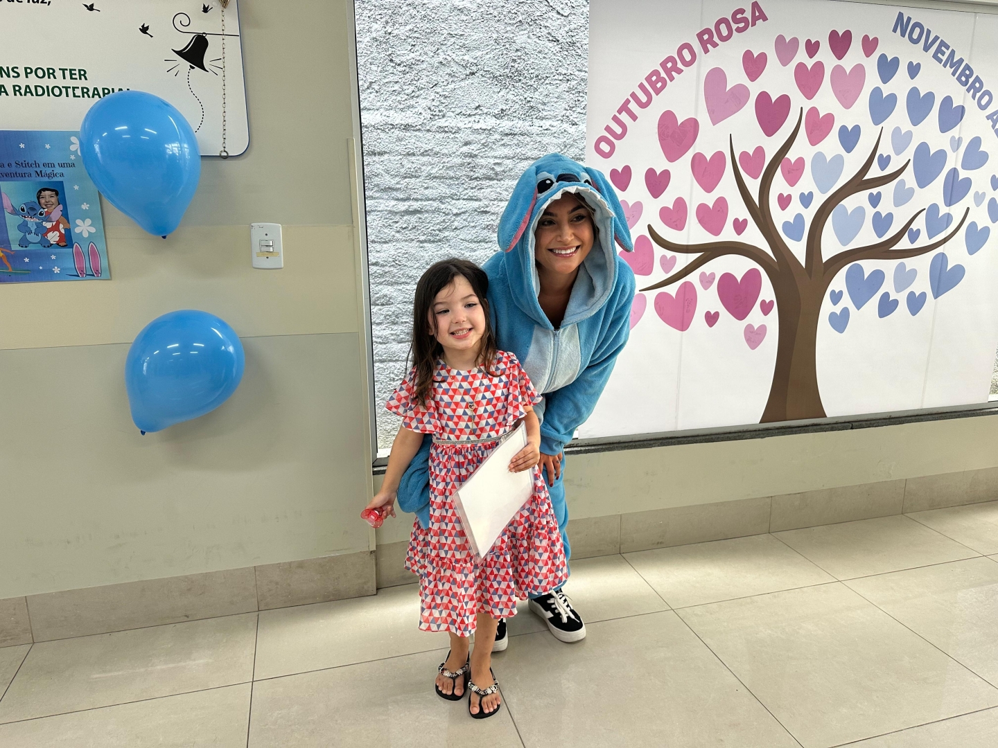 O Stitch, personagem alienígena da animação de grande sucesso Lilo & Stitch, da Disney, é adorado pelas crianças - e até pelos adultos. O simpático bichinho azul e roxo é um dos preferidos da pequena Maisa Pereira Serafim, diagnosticada com um tumor de tronco encefálico, e foi o tema escolhido por ela para uma celebração muito especial. Nesta quinta-feira, dia 30, ela, que é paciente assistida pela Casa Guido, concluiu uma etapa de seu tratamento, finalizando a última sessão de radioterapia, e celebrou no clima do personagem.