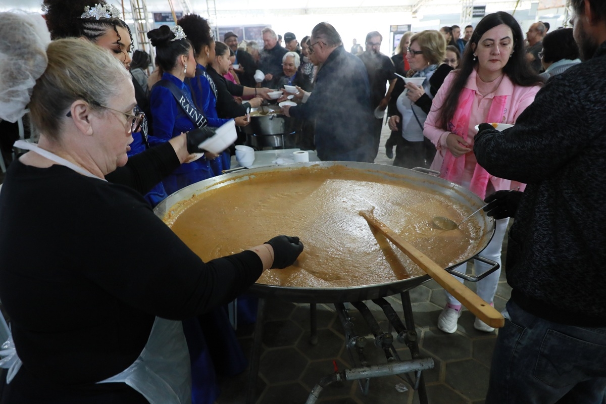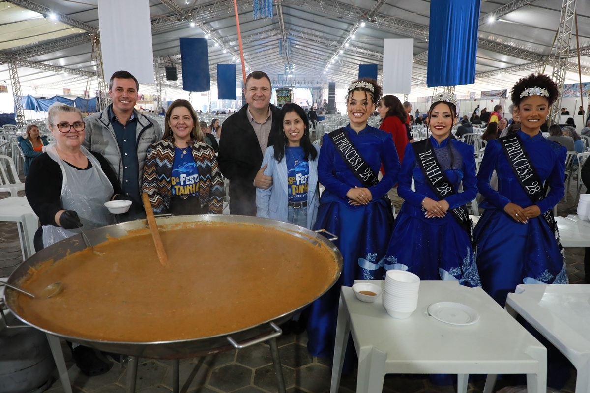 Um dos momentos mais aguardados desta sexta-feira (11), no segundo dia da 28ª Festa da Tainha, do Balneário Rincão, foi a partilha do pirão de peixe, que distribuiu gratuitamente mais de 300 litros do prato típico para moradores e turistas. A ação, inédita, foi organizada pela Rota Gastronômica do Balneário Rincão e reuniu centenas de pessoas em volta das mesas do Pavilhão do evento. Grupos de visitantes vieram de cidades vizinhas para participar do momento, que abriu a praça de alimentação.