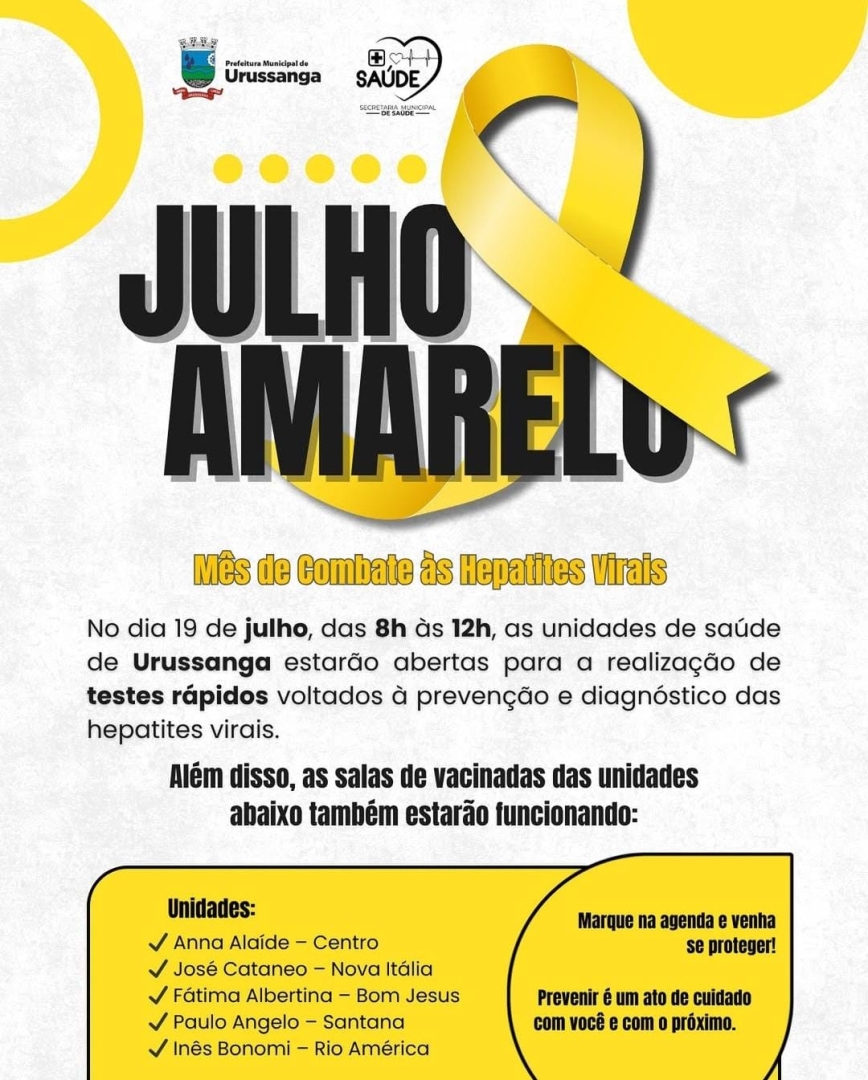 As Unidades de Saúde de Urussanga vão estar abertas neste sábado, dia 19, das 8h às 12h para o Dia D de combate às hepatites virais. A ação promovida pelo Governo Municipal, por meio da Secretaria de Saúde, integra a campanha Julho Amarelo, que visa conscientizar, prevenir e combater as hepatites virais.