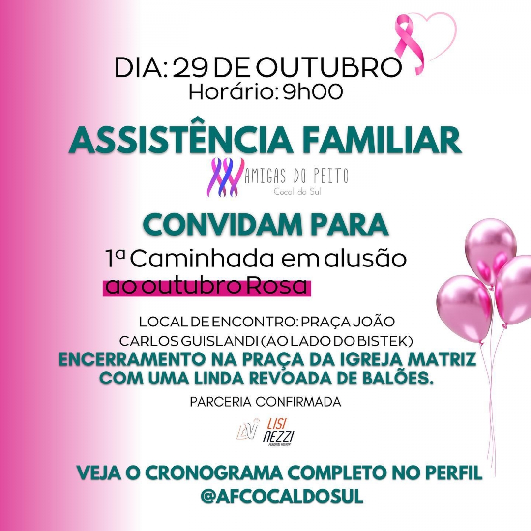 A Assistência Familiar Cocal do Sul, em parceria com a ONG Amigas do Peito, realiza neste sábado (29), às 9h, a Primeira Caminhada em Alusão ao Outubro Rosa. O ponto de partida será na Praça João Carlos Ghislandi, ao lado do Bistek, com encerramento na Praça da Igreja Matriz. A participação é gratuita.