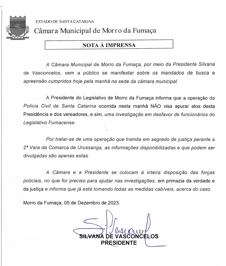 CAMARA DE VEREADORES DE MORRO DA FUMAÇA . NOTA A IMPRENSA
