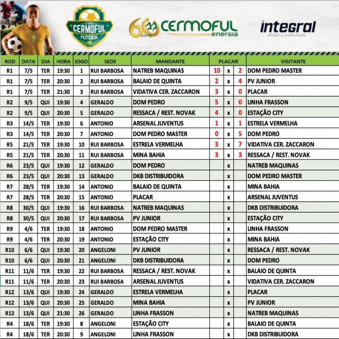 Na próxima quinta-feira, a sede do Geraldo na comunidade de Águas Mornas, em Urussanga, será palco de mais dois jogos pela sexta rodada. Às 19h30, Dom Pedro enfrentará o Natreb Máquinas, e às 20h30, o DKB jogará contra o Dom Pedro Master.