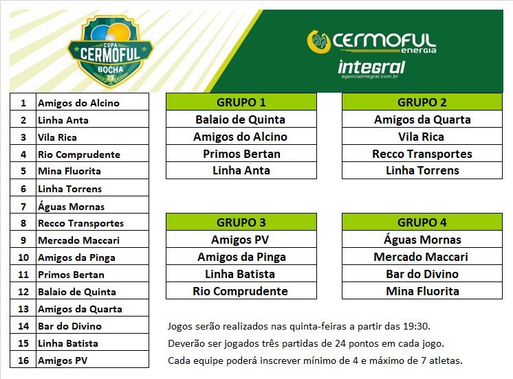 A Cermoful Energia promoveu o congresso técnico para mais uma edição da Copa Cermoful de Bocha, que neste ano contará com a participação de 16 equipes. O evento, realizado nesta segunda - feira (19), definiu os detalhes para o início da competição.