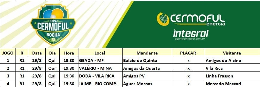 A primeira rodada será realizada no dia 29 de agosto, com quatro partidas marcadas para às 19h30. As sedes distribuídas pela região irão receber confrontos que prometem acirrar a disputa logo no início da competição. Na Cancha do Geada, em Morro da Fumaça, a equipe Balaio de Quinta enfrentará os Amigos do Alcino. Simultaneamente, na Cancha do Valério, localizada na Mina Fluorita, os Amigos da Quarta medirão forças contra o time do Vila Rica.