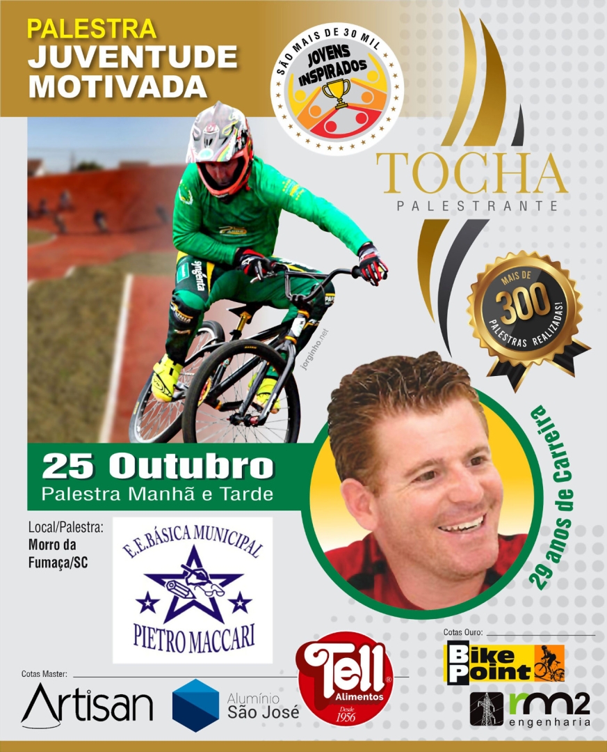Marco Aurélio “Tocha”, piloto de BMX e palestrante motivacional. vai estar na Escola Municipal Pietro Maccari, em Morro da Fumaça, amanhã (25). Próximos desafios acontecem na semana que vem.