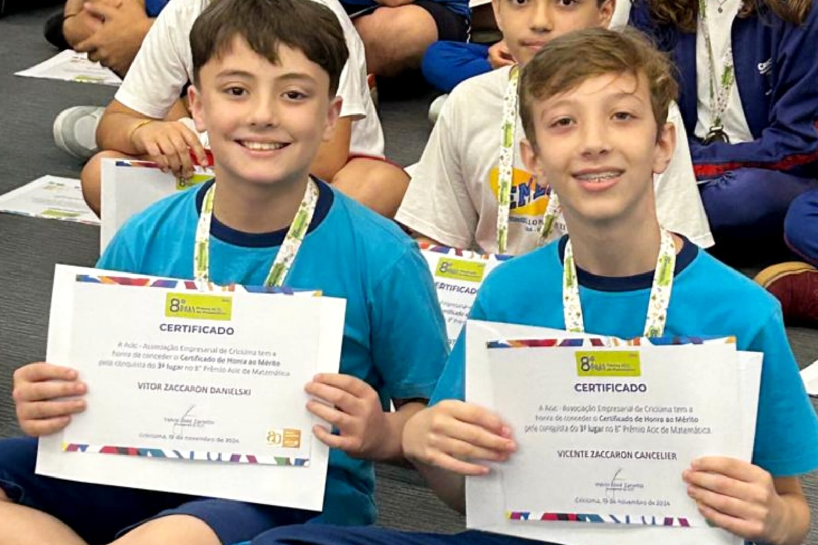 A premiação é um reconhecimento ao esforço e à dedicação de todos os estudantes, que se destacaram nas duas fases do concurso. Os fumacenses Vicente Zaccaron Cancelier, da Escola Pietro Maccari, e Vitor Zaccaron Danilski, da Escola Olivio Recco, foram agraciados com medalhas de bronze pelo bom desempenho nas provas de matemática, que envolveram alunos do quinto ao nono ano do ensino fundamental.