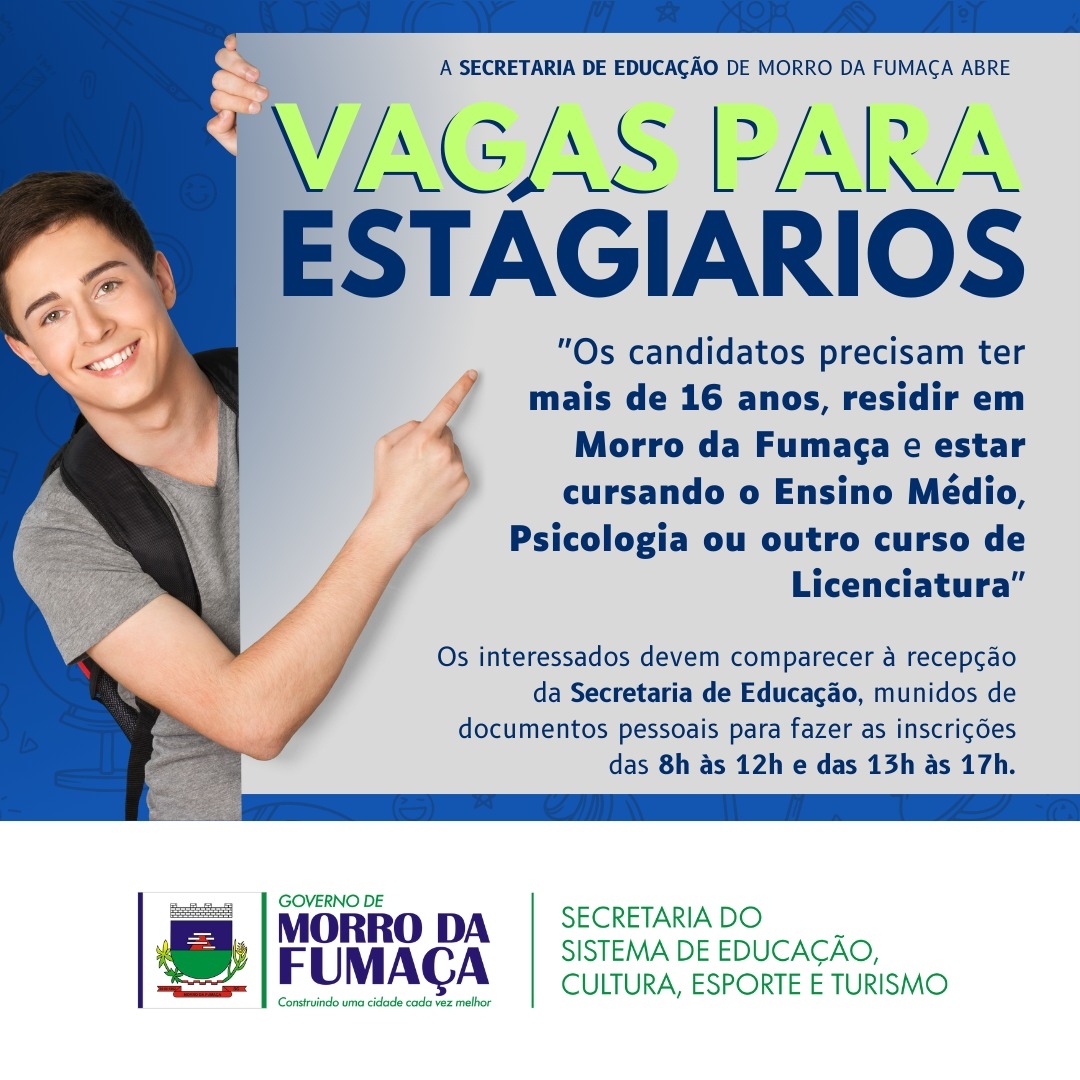 De acordo com o secretário de Educação, Marcos Silveira de Jesus, os candidatos devem ter mais de 16 anos, residir em Morro da Fumaça e estar cursando o Ensino Médio, Psicologia ou outros cursos de Licenciatura.