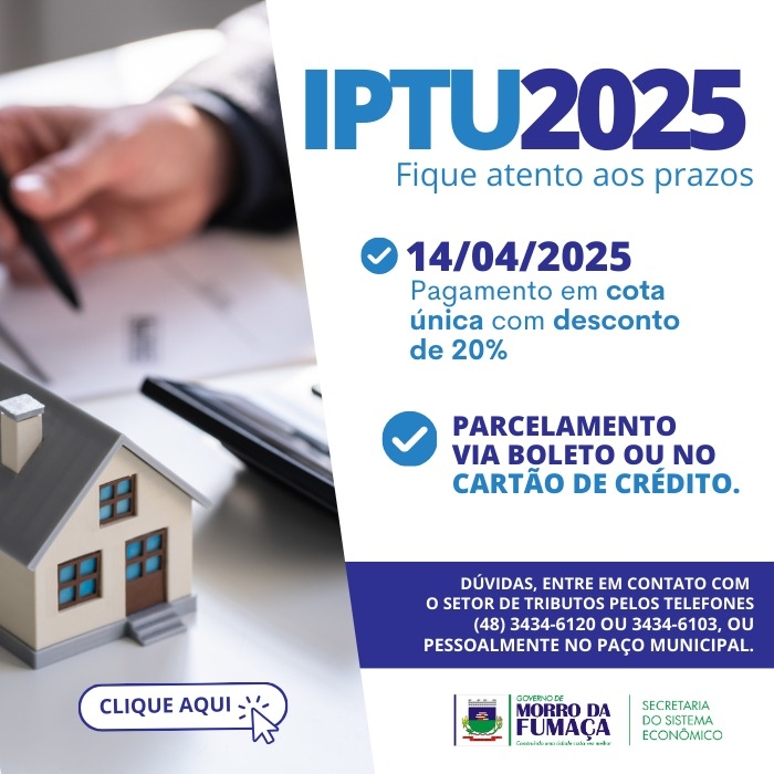 O Governo Municipal de Morro da Fumaça informa que o pagamento do Imposto Predial e Territorial Urbano (IPTU) 2025 em cota única, com desconto de 20%, pode ser retirado e pago somente até o dia 14 de abril, segunda-feira. A guia de pagamento pode ser emitida online, por meio do site morrodafumaca.atende.net, do aplicativo Atende.net, com a adesão ao Débito Direto Autorizado (DDA) ou presencialmente no Paço Municipal.