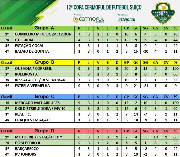 A última vaga para as quartas de final da Copa Cermoful de Futebol Suíço foi definida na noite desta terça-feira (29), em confronto disputado na sede da Celucon, em Morro da Fumaça. Com a vantagem do empate ou até mesmo de uma derrota por dois gols de diferença, o Dom Pedro confirmou a classificação ao empatar por 4 a 4 com o PV Juniors — resultado que também acabou eliminando duas equipes campeãs em edições anteriores da competição.