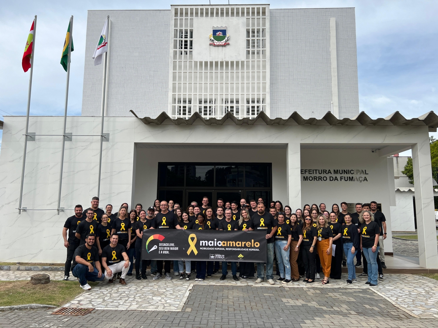 Foram iniciadas, nesta sexta-feira, 2 de maio, as ações da Campanha Maio Amarelo em Morro da Fumaça, que busca promover a conscientização sobre atitudes no trânsito que podem colocar vidas em perigo. Neste ano, com o tema “Desacelere. Seu bem maior é a vida”, a ação educativa destaca as atitudes e rotinas aceleradas da atualidade, que se traduzem também em velocidade e perigo no trânsito. Vestindo a camiseta da iniciativa, servidores municipais se reuniram em frente ao Paço Municipal Auzílio Frasson e exibiram a faixa com o lema deste ano.