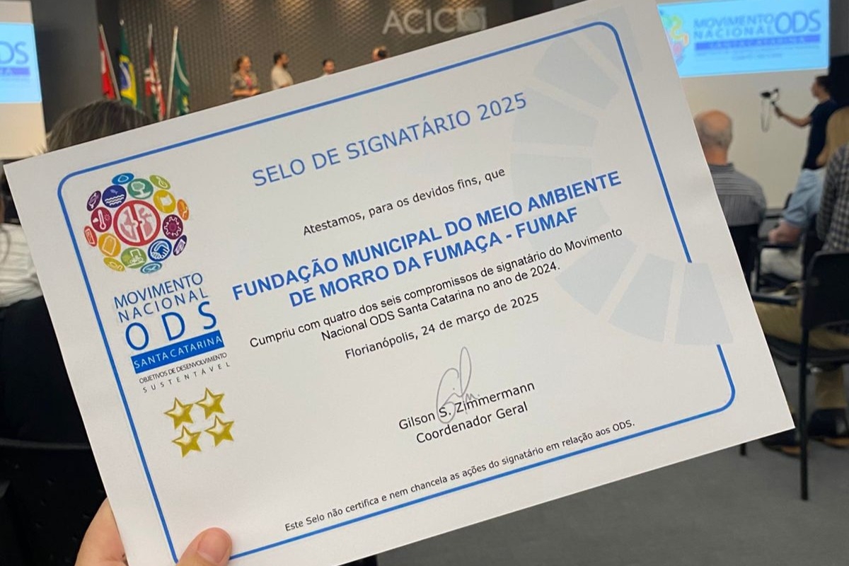 A Fundação Municipal do Meio Ambiente de Morro da Fumaça (Fumaf) recebeu, nesta terça-feira, 27 de maio, o Selo ODS 2025, como signatária dos Objetivos de Desenvolvimento Sustentável da Organização das Nações Unidas (ONU) e integrante do Comitê Criciúma do Movimento Nacional ODS Santa Catarina. O evento aconteceu na sede da Associação Empresarial de Criciúma (Acic).