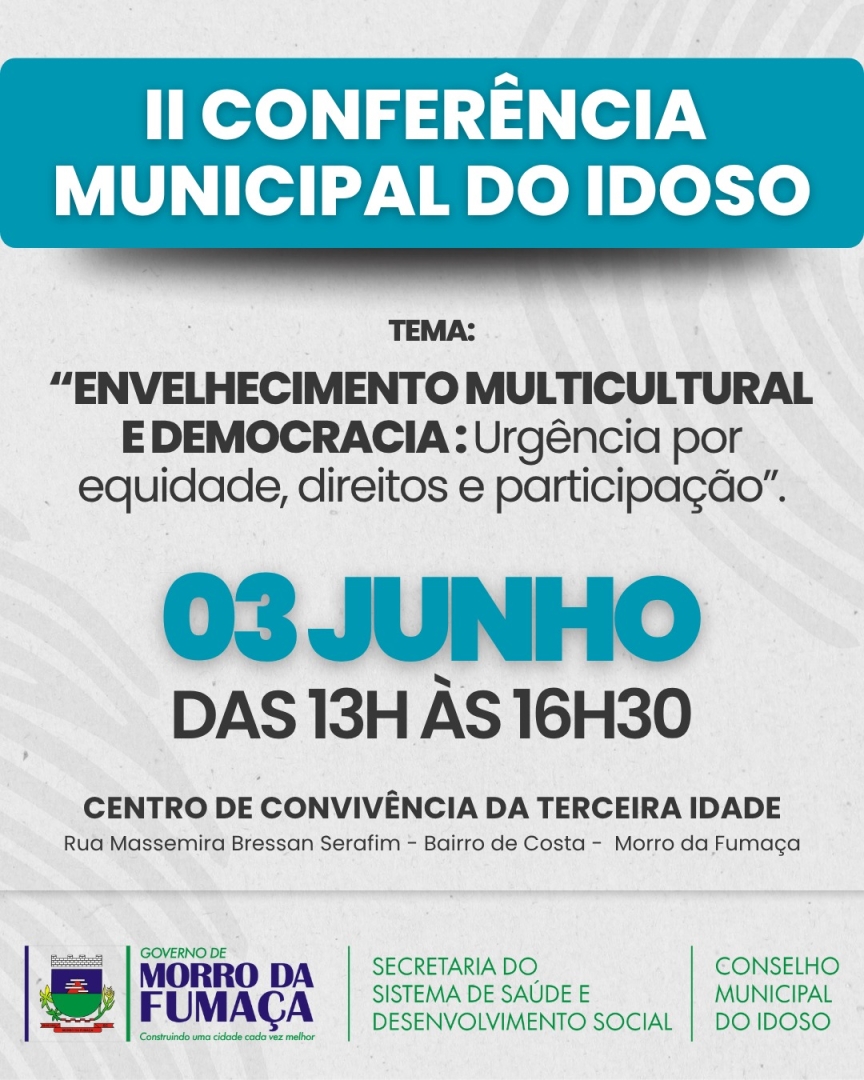 Morro da Fumaça se prepara para sediar a II Conferência Municipal do Idoso, que acontecerá no dia 3 de junho, das 13h às 16h30, no Centro de Convivência da Terceira Idade, localizado na Rua Massemira Bressan Serafim, no Bairro de Costa. Com o tema “Envelhecimento Multicultural e Democracia: urgência por equidade, direitos e participação”, o encontro é promovido pelo Governo Municipal, em parceria com o Conselho Municipal do Idoso, e tem como objetivo ampliar o debate sobre políticas públicas voltadas à pessoa idosa. O evento é aberto ao público e deve reunir representantes da sociedade civil, profissionais da área de assistência social, saúde, educação, além de idosos da comunidade e seus familiares.