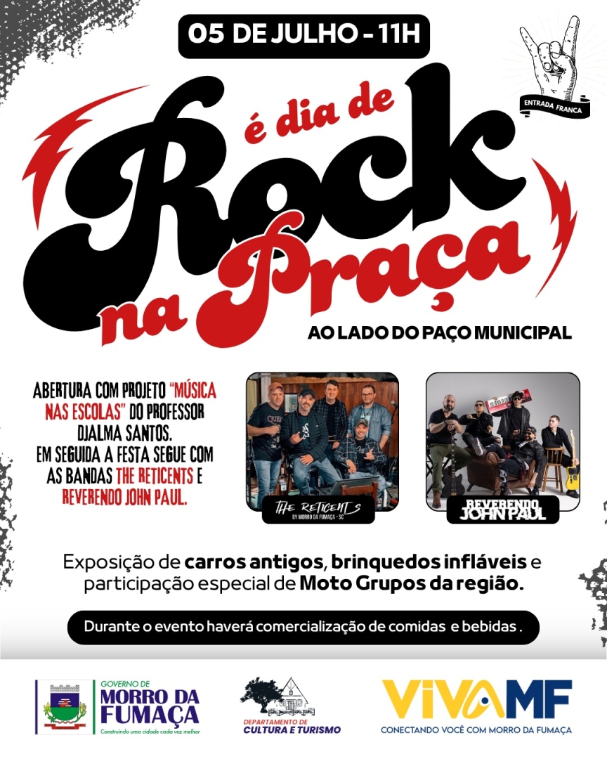 Neste sábado, 5 de julho, a partir das 11h, acontece o evento Rock na Praça, promovido pelo Governo de Morro da Fumaça, por meio do Departamento de Cultura e Turismo. A programação contará com atrações musicais, gastronomia, exposição de carros antigos, brinquedos infláveis e a participação de moto grupos da região. A iniciativa faz parte do projeto Viva MF, que será lançado oficialmente durante o evento, e busca promover a integração entre qualidade de vida, esporte, cultura e turismo para moradores e visitantes de Morro da Fumaça.