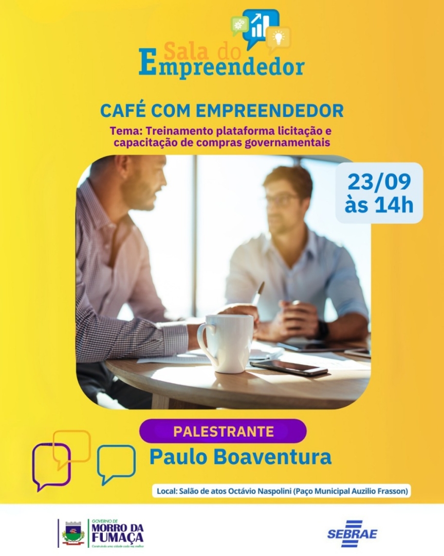 A Sala do Empreendedor de Morro da Fumaça realiza, nesta terça-feira, 23 de setembro, às 14h, o “Café com Empreendedores”, evento que tem como objetivo capacitar empresários e microempreendedores locais. O encontro será realizado no Salão de Atos Octávio Naspolini, no Paço Municipal Auzílio Frasson, e terá como destaque um treinamento voltado à utilização da plataforma de licitações e compras governamentais, com o especialista Paulo Boaventura como palestrante. Durante o evento, os participantes terão a oportunidade de aprender, de forma prática, como acessar e utilizar a ferramenta para participar de processos licitatórios, ampliando as possibilidades de negócios com o setor público.