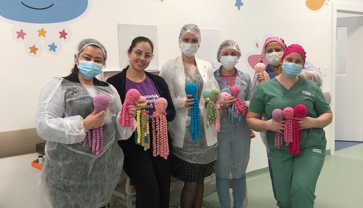 _Os Polvos Amigurumi se assemelham ao cordão umbilical e ajudam bebês prematuros na recuperação. A entrega foi feita no Hospital Materno Infantil Santa Catarina _