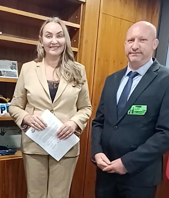 Na foto, vereador Diogo Nicolau entrega Moção de Apoio aprovada pela Câmara Municipal de Lindóia do Sul à deputada, em Brasília