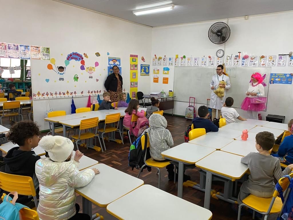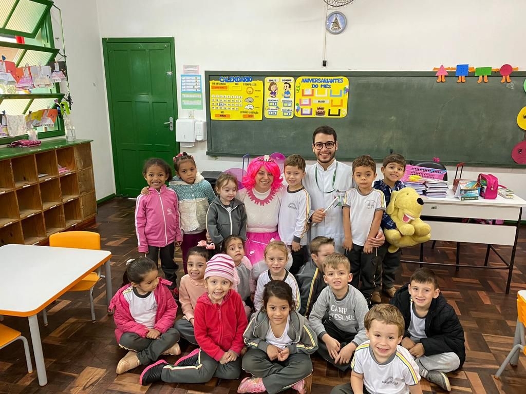 As crianças estão recebendo a visita de profissionais, que estão orientando sobre os hábitos corretos desde a infância