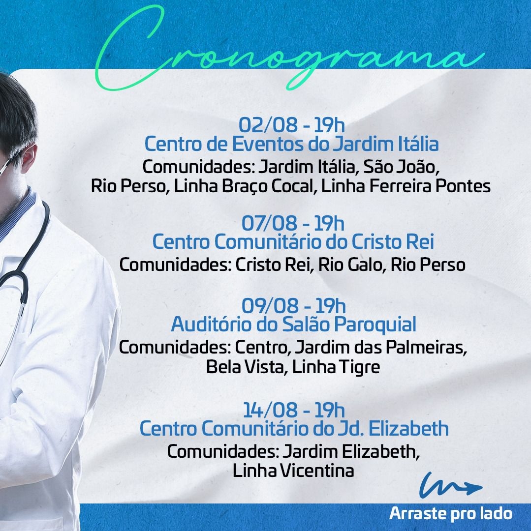 -> Jardim Itália – 02/08 - 19h. Local: Centro de Eventos. (Comunidades: Jardim Itália, São João, Rio Perso, Linha Braço Cocal, Linha Ferreira Pontes);
