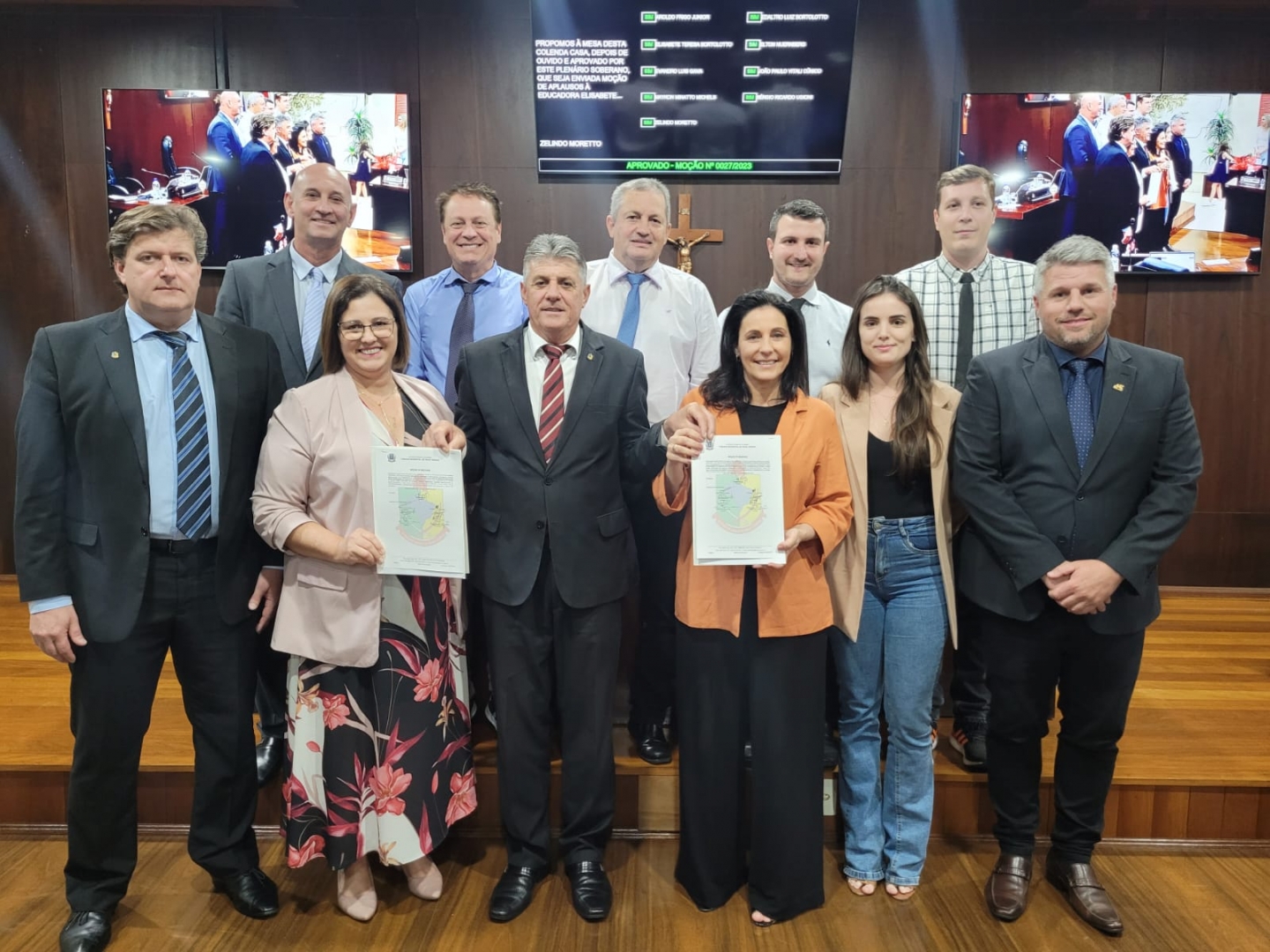 A segunda homenageada, a educadora e também vereadora Elisabete Teresa Bortolotto, também foi agraciada com uma moção de aplausos pelos vinte e oito anos de serviços como professora e pelos oito anos de gestão na Escola Básica Municipal Bairro Bortolotto. Bete foi reverenciada por sua atuação com zelo, responsabilidade e organização, sempre priorizando a eficiência em sua missão educacional.