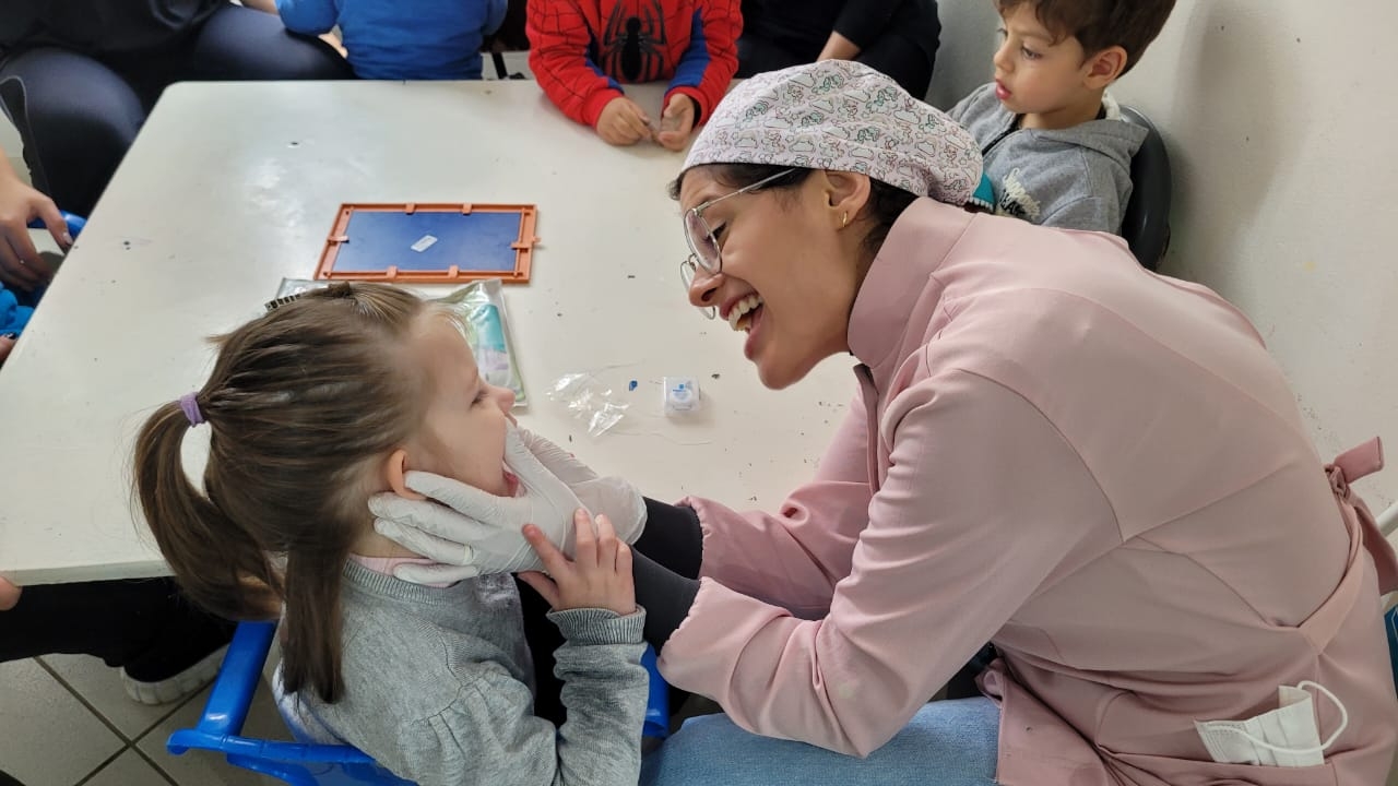 Mas, nos últimos meses, a escola passou a ter uma grande aliada neste trabalho: a odontopediatra, Jéssica Vargas Teixeira. De forma voluntária, a dentista se compromete com a causa, desempenhando um papel crucial nesse esforço. Doando uma vez por semana, o seu tempo e perícia para garantir que cada aluno receba uma avaliação odontológica de forma regular. Essas avaliações contribuem para a identificação precoce de quaisquer problemas de saúde bucal, permitindo o encaminhamento para o tratamento oportuno.