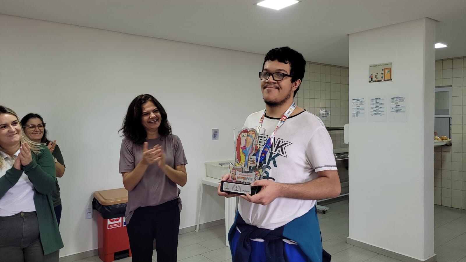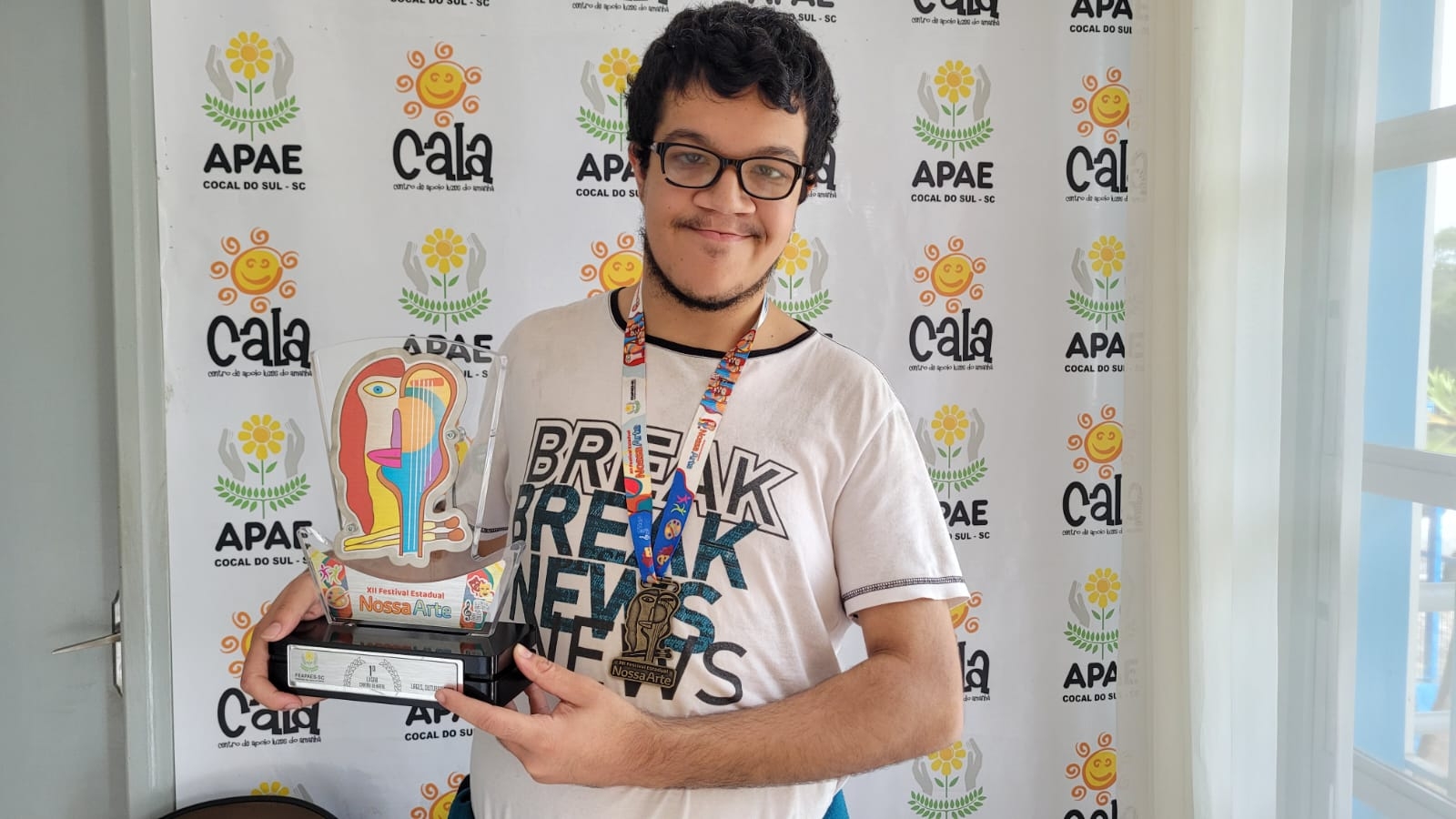 A criatividade e dedicação de um aluno da APAE Cocal do Sul se destacaram em Santa Catarina durante a etapa estadual do Festival Nossa Arte. Natan José Biela, de 23 anos, conquistou o 1º lugar na categoria Cartão de Natal, apresentando uma arte que incorpora não apenas imagens natalinas, mas também destaca a APAE como o centro da mensagem. O artista foi homenageado por colegas e professores na manhã de quarta-feira (25), quando recebeu o troféu e a medalha do prêmio no refeitório da escola.