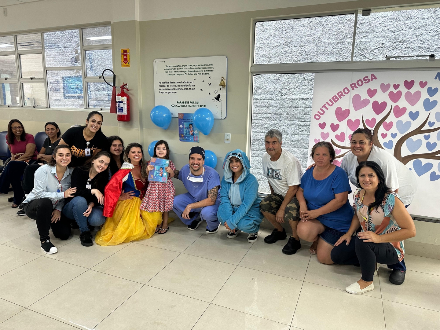 A enfermeira Larissa, a técnica de enfermagem Tainara e o médico anestesiologista dr. Guilherme, junto de toda a equipe de Radioterapia, entraram no clima da festa, com direito a usar fantasias do Stitch e da Branca de Neve, tudo pensado com muito carinho e dedicação.