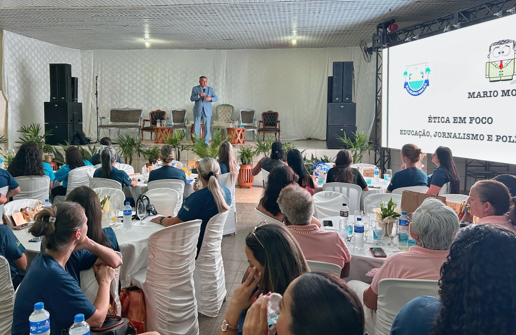 Durante a palestra, Mário Motta destacou a importância da comunicação na educação e o papel dos professores na formação crítica dos alunos. Com uma trajetória consolidada na imprensa, o jornalista compartilhou experiências e reflexões sobre o impacto da informação no ambiente escolar.