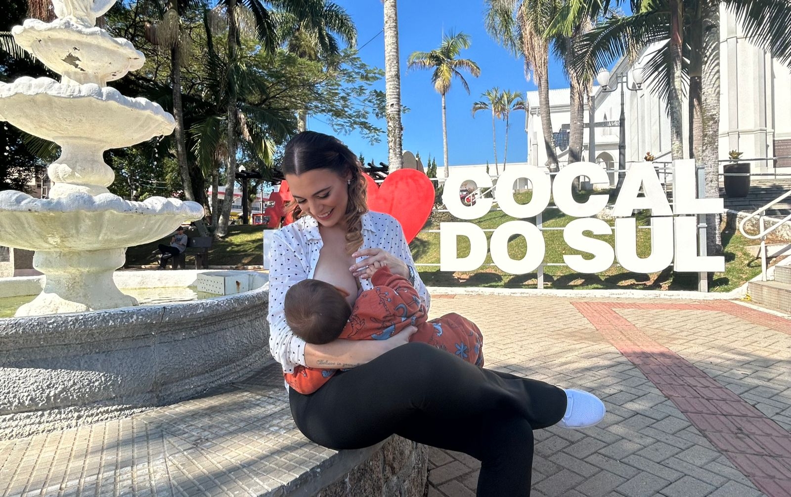 Moradora de Cocal do Sul, Bruna Mendes é mãe do pequeno Pedro e sabe, na prática, o que significa amamentar com liberdade. Seja no carro, na praça ou no meio do mercado, ela amamenta sempre que o filho precisa. Para ela, nutrir vai além do alimento: é vínculo, é cuidado, é presença.