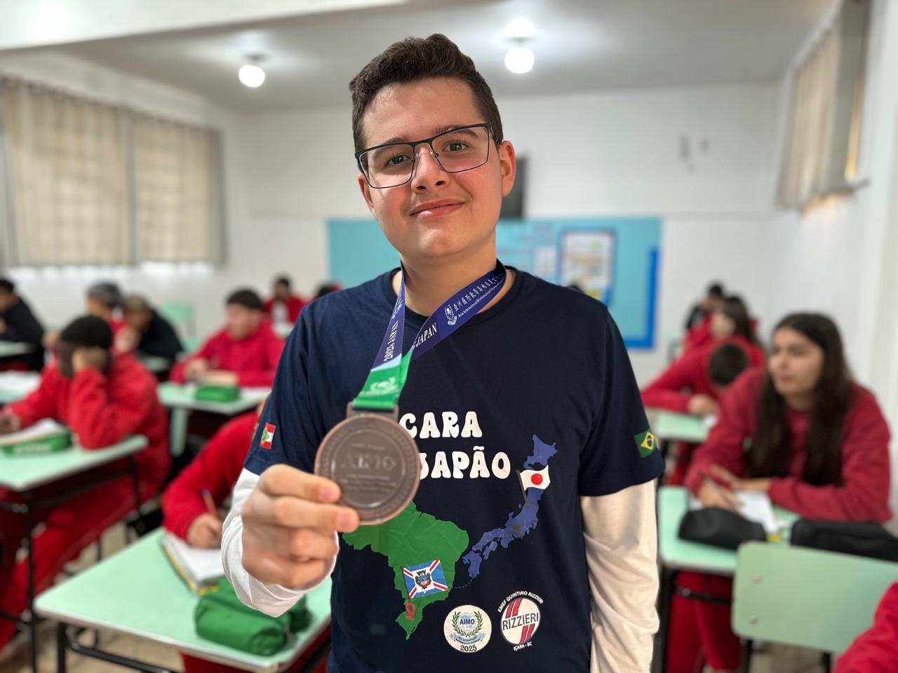No final de 2024, ainda radiantes com a conquista, receberam o convite para a AIMO- Tokyo. A partir do convite, no início deste ano, a gestão municipal autorizou a viagem de 10 estudantes para o Japão. A Secretaria de Educação, com a escola, organizaram uma seletiva interna, entre os 24 estudantes medalhistas de ouro, que tinham interesse em participar da AIMO.