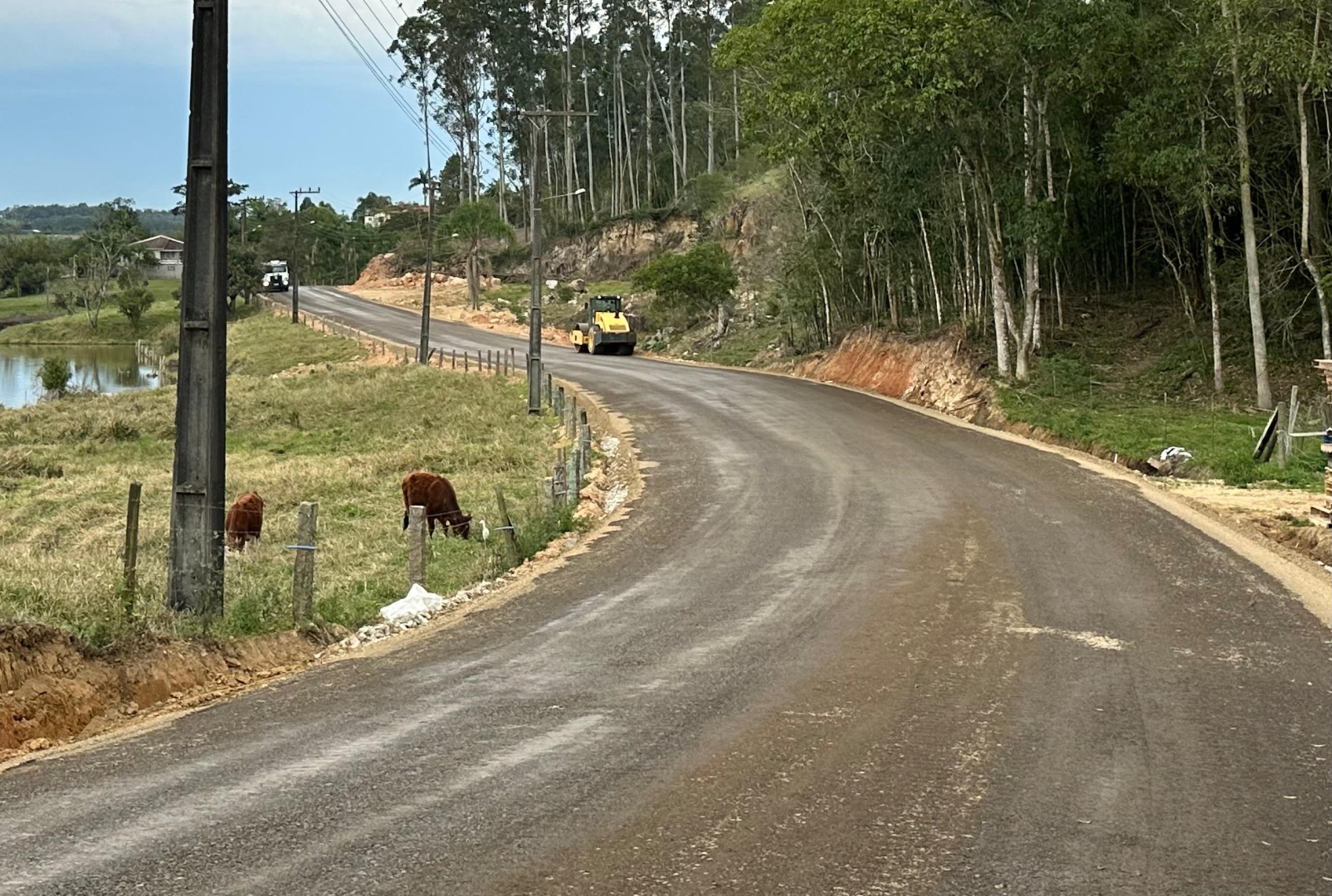 A pavimentação no interior de Cocal do Sul segue em ritmo acelerado e já alcançou uma etapa importante. No trecho da comunidade do Rio Comprudente, parte da estrada está com toda a base concluída e compactada, pronta para receber a camada de asfalto.