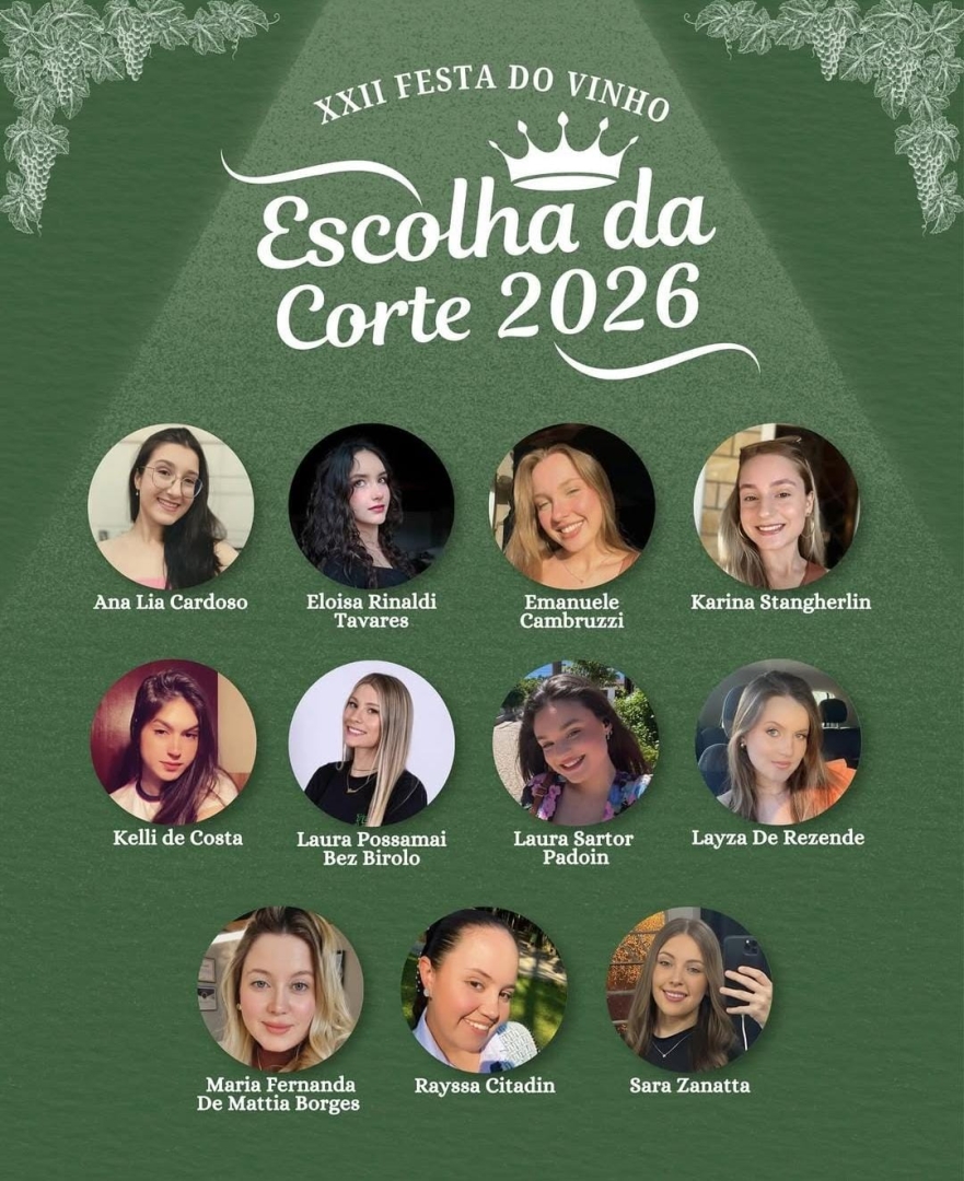 As candidatas à Corte da Festa do Vinho 2026 foram apresentadas nesta segunda-feira, dia 10, pela Comissão da Central Organizadora (CCO), em parceria com o Governo Municipal de Urussanga. Ao todo, 11 meninas concorrem ao título de rainha e princesas da festa que chega na 22ª edição enaltecendo a cultura e a beleza da cidade. A escolha da Corte será realizada no dia 8 de dezembro, às 19h30, no Ginásio Centenário.
