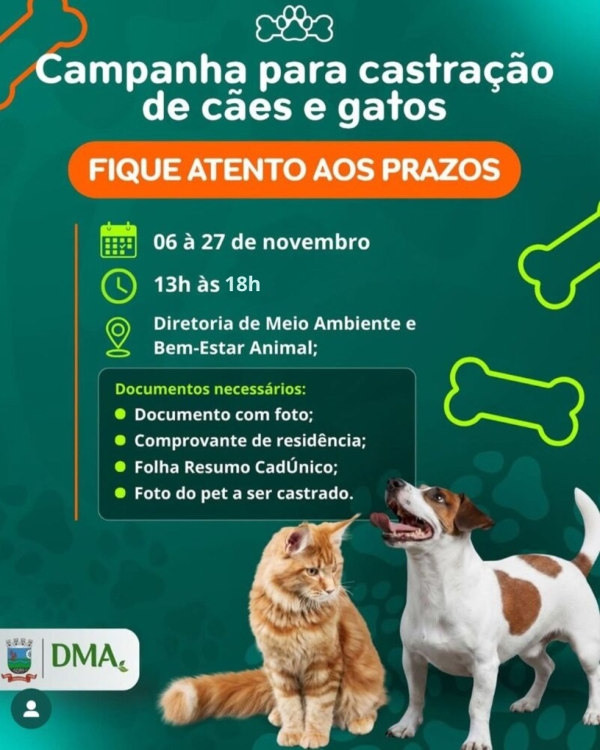 Para realizar o cadastro é necessário apresentar documento com foto, comprovante de residência, folha resumo do CadÚnico e a foto do cão ou gato que deve ser castrado. "A castração é uma grande aliada na prevenção de doenças e ajuda a controlar a quantidade de cães e gatos, que geram preocupação ambiental e de saúde pública", comenta o diretor do DMA, Osmanny Francisco.