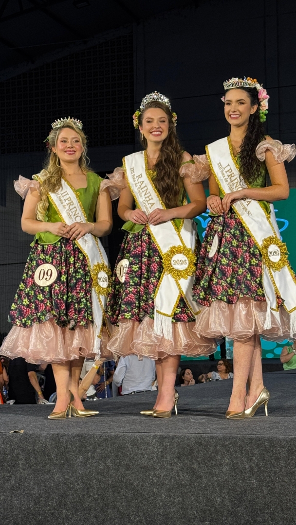A nova Corte da Festa do Vinho 2026 foi definida na segunda-feira, dia 8, em noite de emoção, ginásio lotado e a euforia das torcidas das 11 candidatas que estavam na disputa pela coroa em Urussanga. Emanuele Cambruzzi foi eleita Rainha, Eloisa Rinaldi Tavares conquistou o título de 1ª Princesa e Maria Fernanda De Mattia Borges foi escolhida como 2ª Princesa.