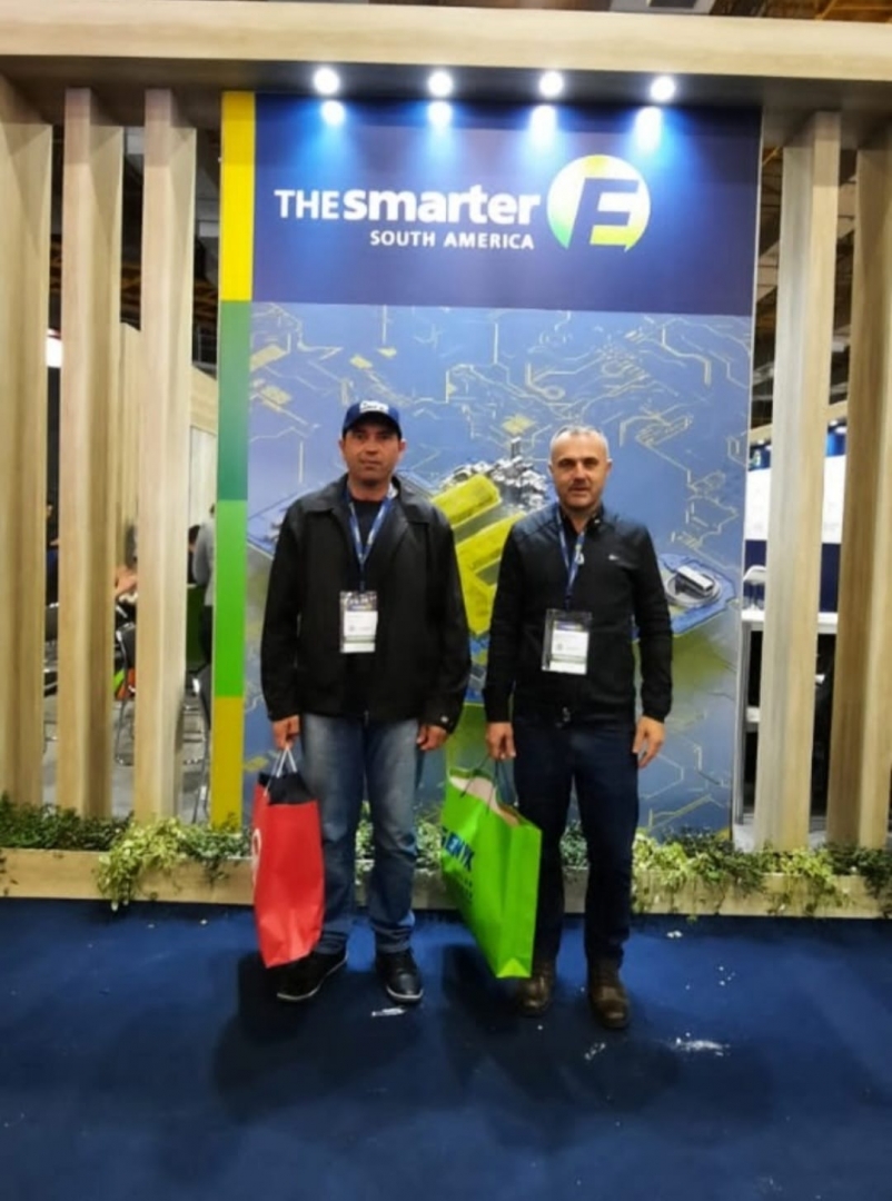 Estiveram na feira “The Smarter E South America”, no Expo Center Norte, os engenheiros eletricistas, Adelcio Cavagnolli e Samuel Sartor.