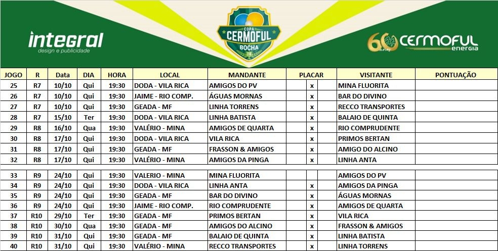 Os confrontos da segunda fase da Copa Cermoful de Bocha - Taça Cermoful 60 Anos estão definidos. A tabela foi sorteada nesta terça-feira (8) e as primeiras disputas começam nesta quinta-feira (10), com as equipes entrando em cancha para os jogos de ida. As partidas foram disputadas nas canchas do Doda, Geada, Jaime e Valério.