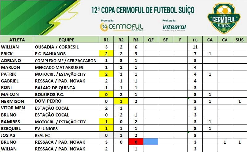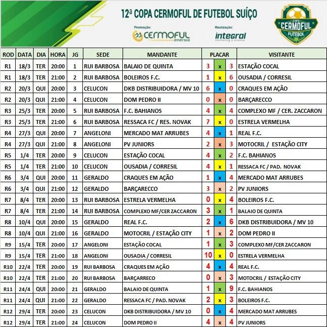 A última vaga para as quartas de final da Copa Cermoful de Futebol Suíço foi definida na noite desta terça-feira (29), em confronto disputado na sede da Celucon, em Morro da Fumaça. Com a vantagem do empate ou até mesmo de uma derrota por dois gols de diferença, o Dom Pedro confirmou a classificação ao empatar por 4 a 4 com o PV Juniors — resultado que também acabou eliminando duas equipes campeãs em edições anteriores da competição.
