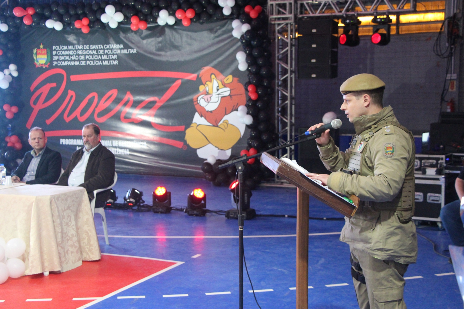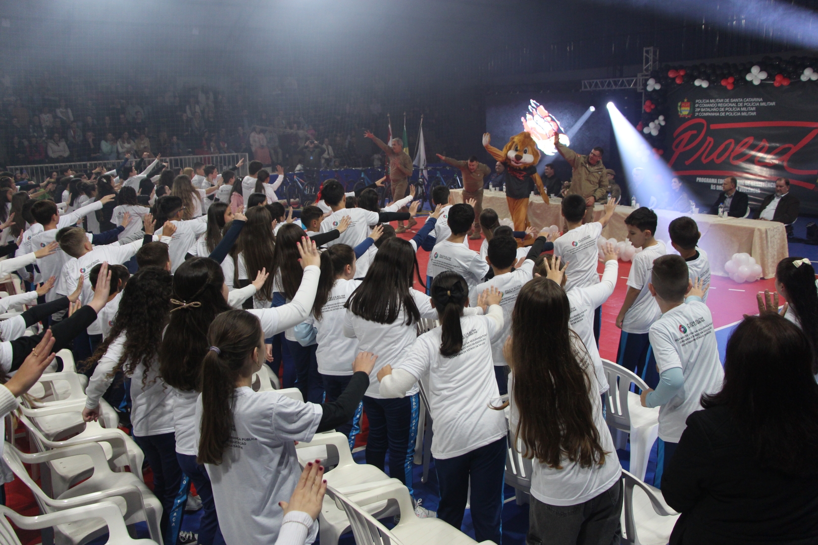 O Ginásio de Esportes Jorge Silva foi tomado por aplausos, emoção e o brilho nos olhosde 290 alunos que concluíram o Programa Educacional de Resistência às Drogas e à Violência (Proerd), em Morro da Fumaça. A cerimônia, realizada na noite de quarta-feira, 9 de julho, reuniu autoridades locais, professores, familiares e representantes da Polícia Militar, além do carismático mascote Daren, que fez a festa com a criançada.
