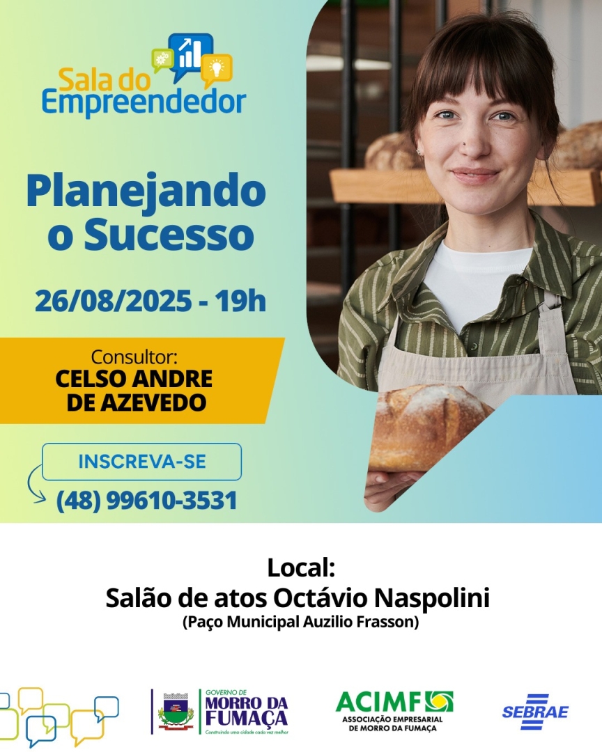 Com o objetivo de fortalecer o ecossistema empreendedor do município, a Sala do Empreendedor de Morro da Fumaça realiza, no próximo dia 26 de agosto de 2025, às 19h, a palestra gratuita “Planejando o Sucesso”, no Salão de Atos Octávio Naspolini, no Paço Municipal Auzilio Frasson, ao lado da Prefeitura Municipal. A palestra será conduzida pelo consultor Celso Andre de Azevedo, em ação promovida em parceria com o Sebrae e Associação Empresarial de Morro da Fumaça (Acimf). Antes do evento principal, haverá uma palestra sobre microcrédito com a agente de crédito Aline de Lima Sucssel, das 18h30 às 19h. As vagas são limitadas.