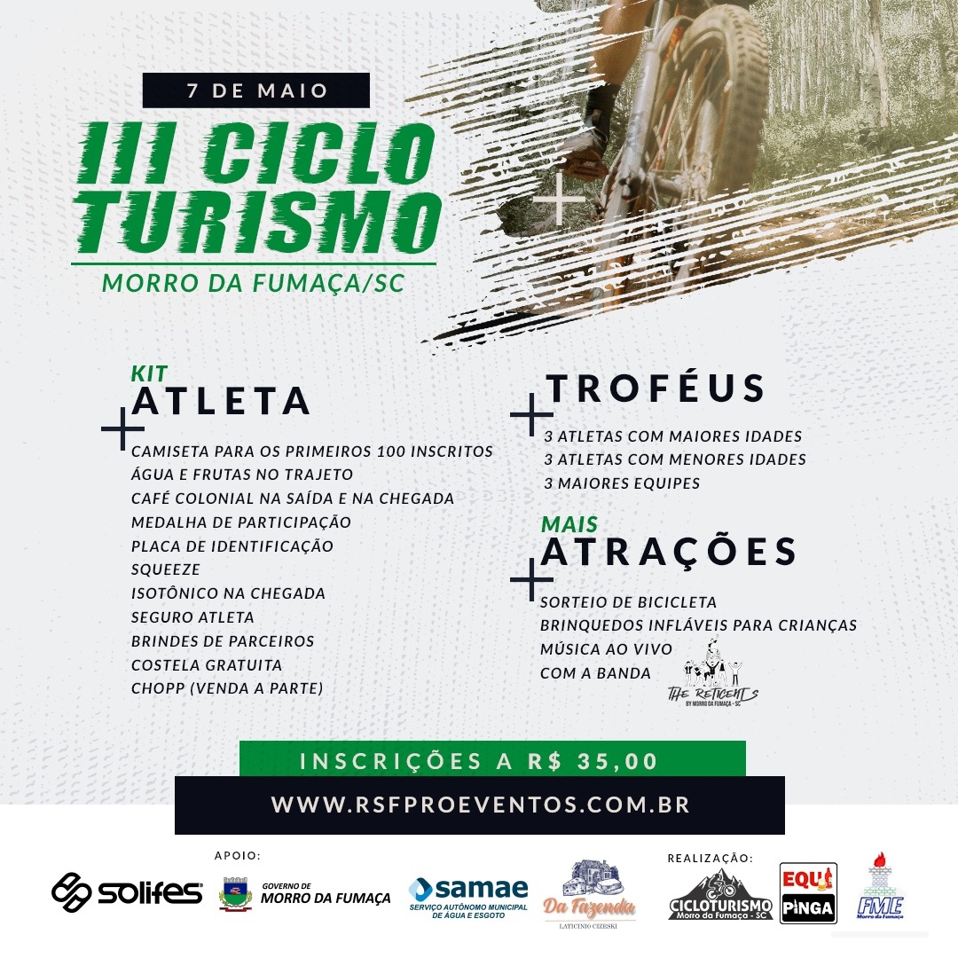 Conforme o vice-prefeito de Morro da Fumaça, Eduardo Sartor Guollo, é um evento para toda família, não só para ciclistas. “Além dos inscritos, contamos com a presença dos familiares, que venham prestigiar junto, tornando a festividade ainda maior. Teremos atrações para todo tipo de público. As duas primeiras edições do evento já foram muito bem quista pelas pessoas, agora estamos planejando algo ainda maior. Será um trajeto diferente, com trilhas novas e mais atratividades aos participantes ”, almeja.