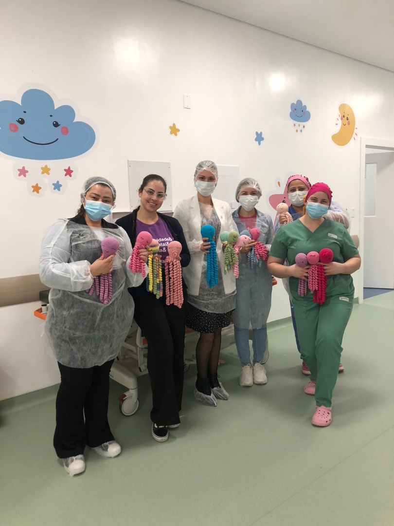 _Os Polvos Amigurumi se assemelham ao cordão umbilical e ajudam bebês prematuros na recuperação. A entrega foi feita no Hospital Materno Infantil Santa Catarina _