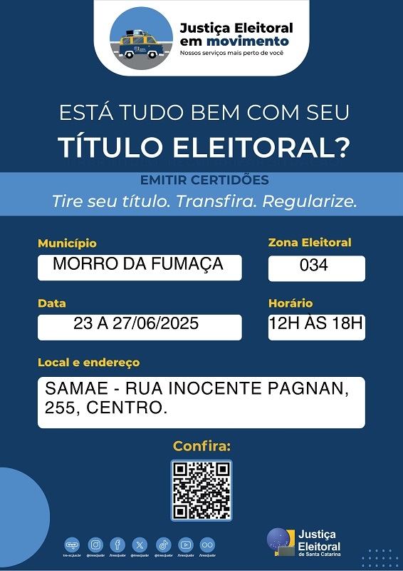 A Justiça Eleitoral estará novamente em Morro da Fumaça entre os dias 23 e 27 de junho de 2025, das 12h às 18h, oferecendo atendimento volante para emissão, transferência e regularização do título eleitoral, além de outros serviços, como a emissão de certidões. O atendimento será realizado na sede do Serviço Autônomo Municipal de Água e Esgoto (Samae), localizada na Rua Inocente Pagnan, 255 – Centro.