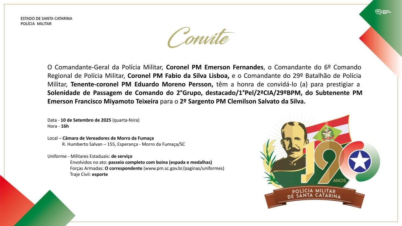 A Polícia Militar de Santa Catarina realiza, na próxima quarta-feira, 10 de setembro de 2025, às 16h, a solenidade oficial de passagem de comando do 2º Grupo, destacado/1º Pelotão/2ª Companhia/29º Batalhão de Polícia Militar (BPM), em Morro da Fumaça. O ato acontecerá no plenário da Câmara de Vereadores, localizada na Rua Humberto Salvan, nº 155, no bairro Esperança.