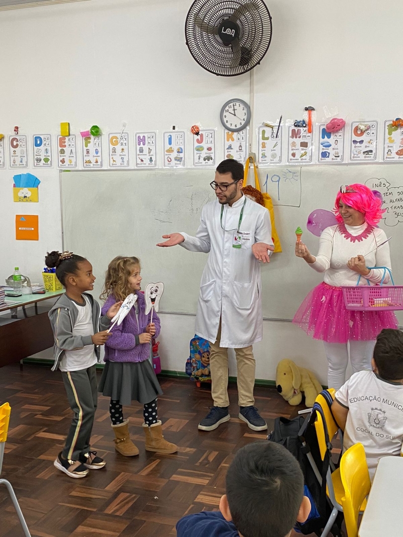 As crianças estão recebendo a visita da fada do dente, da princesa Elsa e, claro, dos profissionais da saúde bucal. O intuito é ensinar os hábitos corretos desde a infância, garantindo dentes fortes e saudáveis na fase adulta.