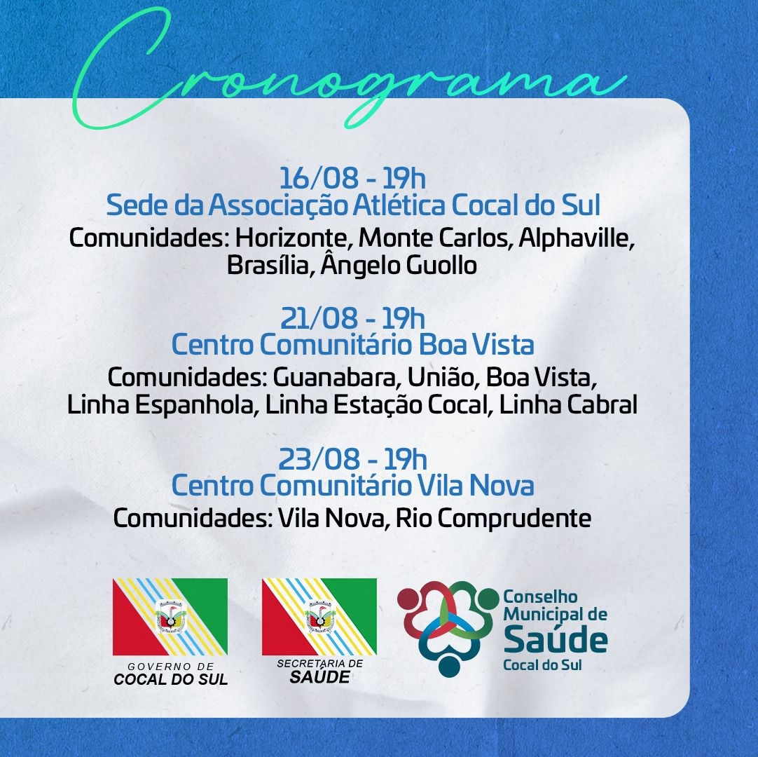 -> Horizonte – 16/08 – 19h. Local: Sede da Associação Atlética Cocal do Sul (anexo ao campo municipal). (Comunidades: Horizonte, Monte Carlos, Alphaville, Brasília, Ângelo Guollo);